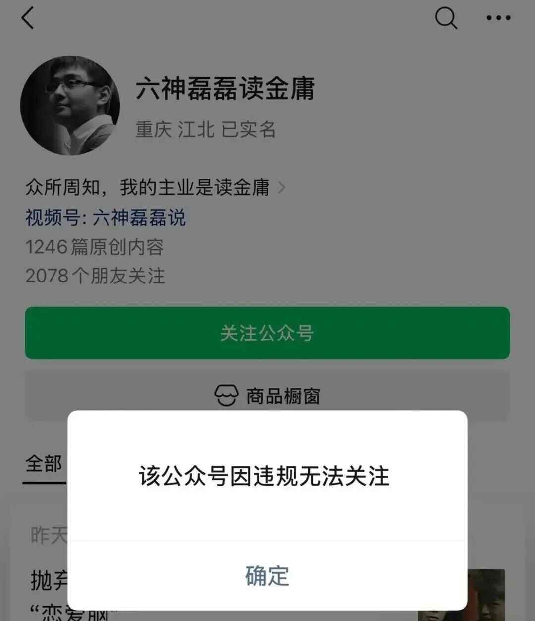 12月14日中午,记者注意到,粉丝众多的微信公众号“六神雷雷读金庸”因违规无法关注。关注该账号的网友通常可以打开他之前的大部分文章;不关注该账号的网友无法通过搜索关注该账号。 14日下午,记者注意到,没有关注该账号的人,已经无法通过搜索功能找到“六神雷雷读金庸”的微信公众号了。同时,记者发现“六神雷乐”的相关视频账号依然可以正常关注,还有微博、抖音。涉事者的另一个微信公众号“六神雷雷读唐诗”也显示正常,其视频号“六神雷雷说”也能正常搜索和关注。公开信息显示,六神雷雷的真名是王小雷。 1984年8月17日出生于彝族自治州铜鼓县江西省椿市。毕业于北京广播学院(现中国传媒大学)。原创自媒体作者,腾讯《全部》专栏作家。 2016年获得中国年度新人榜“年度新媒体”(个人)等奖项。来源 |新黄河、积木新闻、都市快报