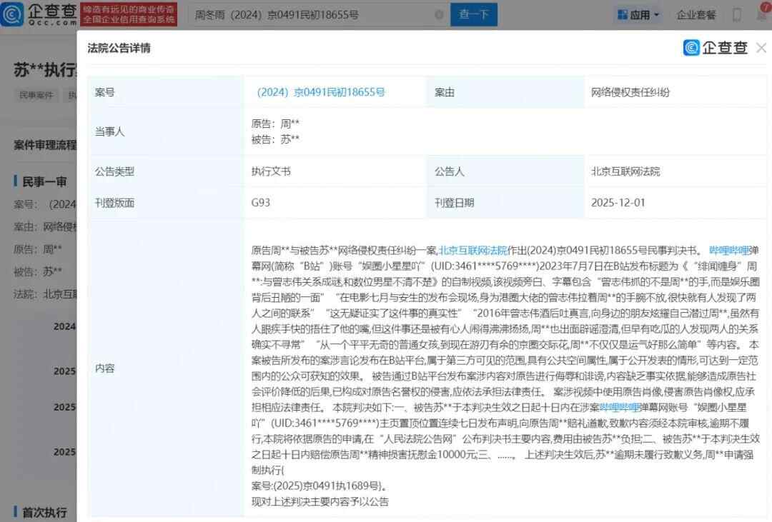 据媒体12月1日报道,企查查APP显示,法院近日公布了周冬雨诉苏某网络侵权纠纷一案的民事判决书。判决书显示,被告苏某公开发表“曾志伟对周冬雨的潜规则”、“周冬雨是北京交际花”等言论,构成对周冬雨名誉权的侵犯。法院判决苏某须自判决之日起十日内向周冬雨公开赔礼道歉,并支付精神损害赔偿金1万元。上述判决发生后,苏某某未履行限期赔礼道歉义务,周冬雨申请d 执行。公开资料显示,曾志伟,1953年4月14日出生,中国香港演员、导演、编剧、监制、制作人、制片人、主持人。 1974年,曾志伟开始担任龙虎武师;同年拍摄个人首部影视作品《哪吒》; 1981年,曾志伟导演的第一部电影《最佳搭档》成为香港电影史上第一部票房超过2000万的电影; 19 1991年,曾志伟凭借《双城记》获得第11届香港电影金像奖最佳男主角奖; 1996年11月,其参演的爱情电影《亲爱的》上映,并凭借该片获得第16届香港电影金像奖最佳男配角奖。据媒体报道,2021年1月,曾志伟受邀重返TVB,出任副总经理,负责综艺、音乐制作等节目。 9月27日,TVB宣布任命曾志伟担任TVB总经理,负责节目内容运营,包括各类内容的制作(综艺、合拍剧、音乐)以及节目收购和策划。他也因此成为TVB史上晋升最快的总经理。周冬雨,1992年1月31日出生于河北省石家庄市,毕业于北京电影学院表演系,中国内地男演员。 2010年,主演的爱情电影《山楂树之恋》上映,以“谋女郎”身份正式出道。她还主演了电影《七月与安生》。 2018年,凭借爱情电影《下一个我们》获得第32届中国金鸡奖最佳女主角提名; 2020年,凭借校园电影《少年的你》获得第39届香港电影金像奖最佳女主角、第33届中国金鸡奖最佳女主角,成为华语第三位完成三项最佳女主角奖项的男演员。据悉,电影《七月与安生》都是曾志伟饰演的。来源九派新闻、白鹿视频